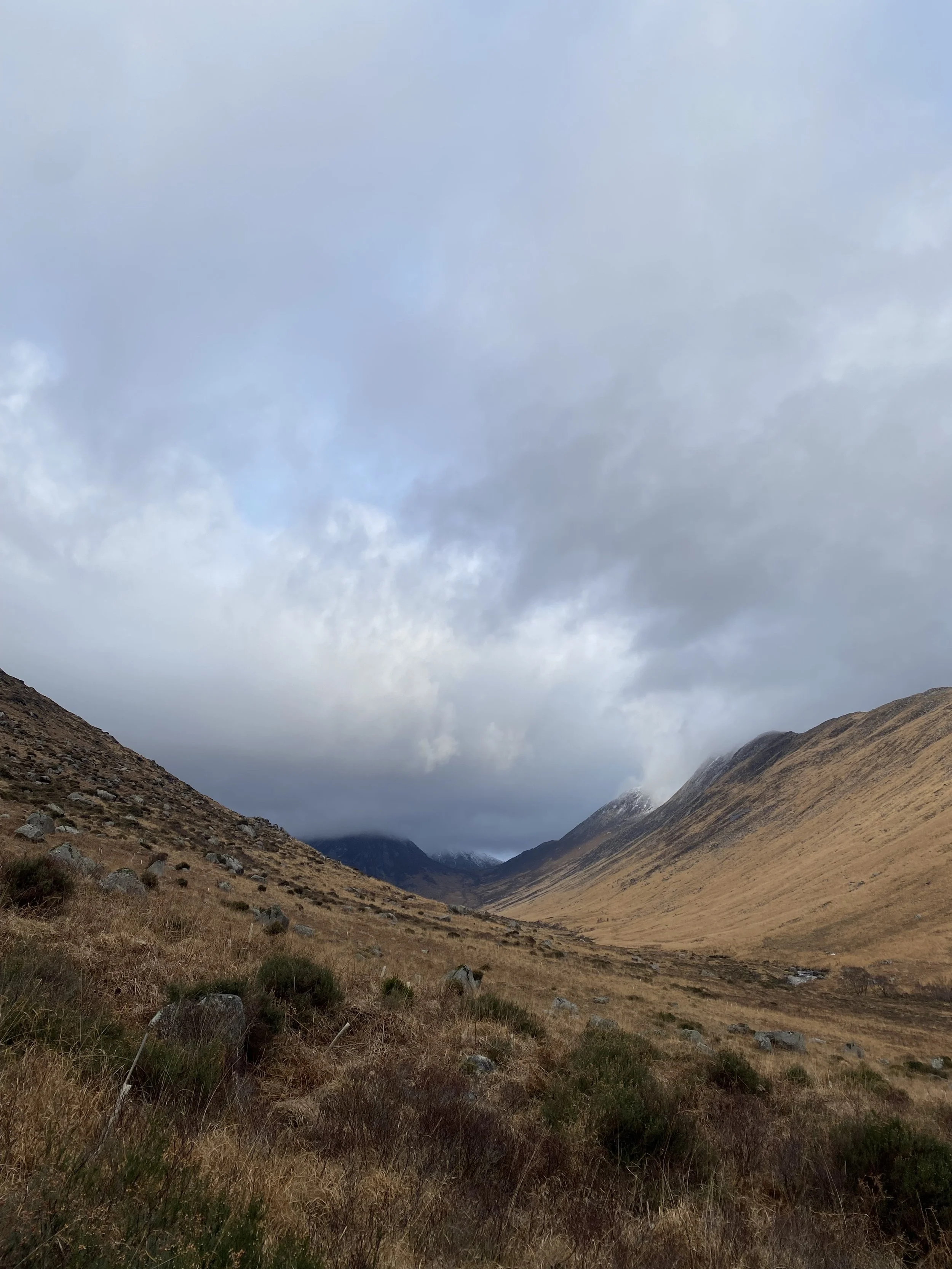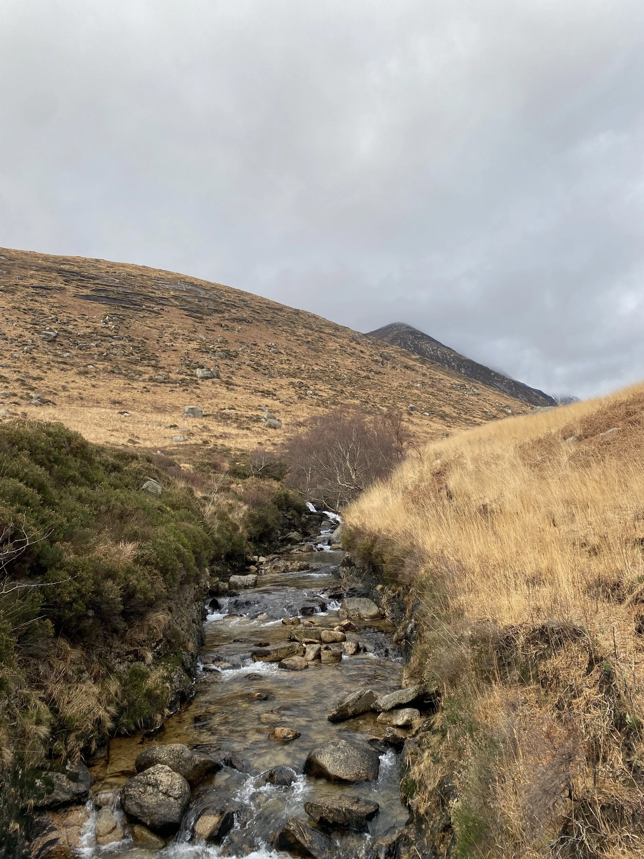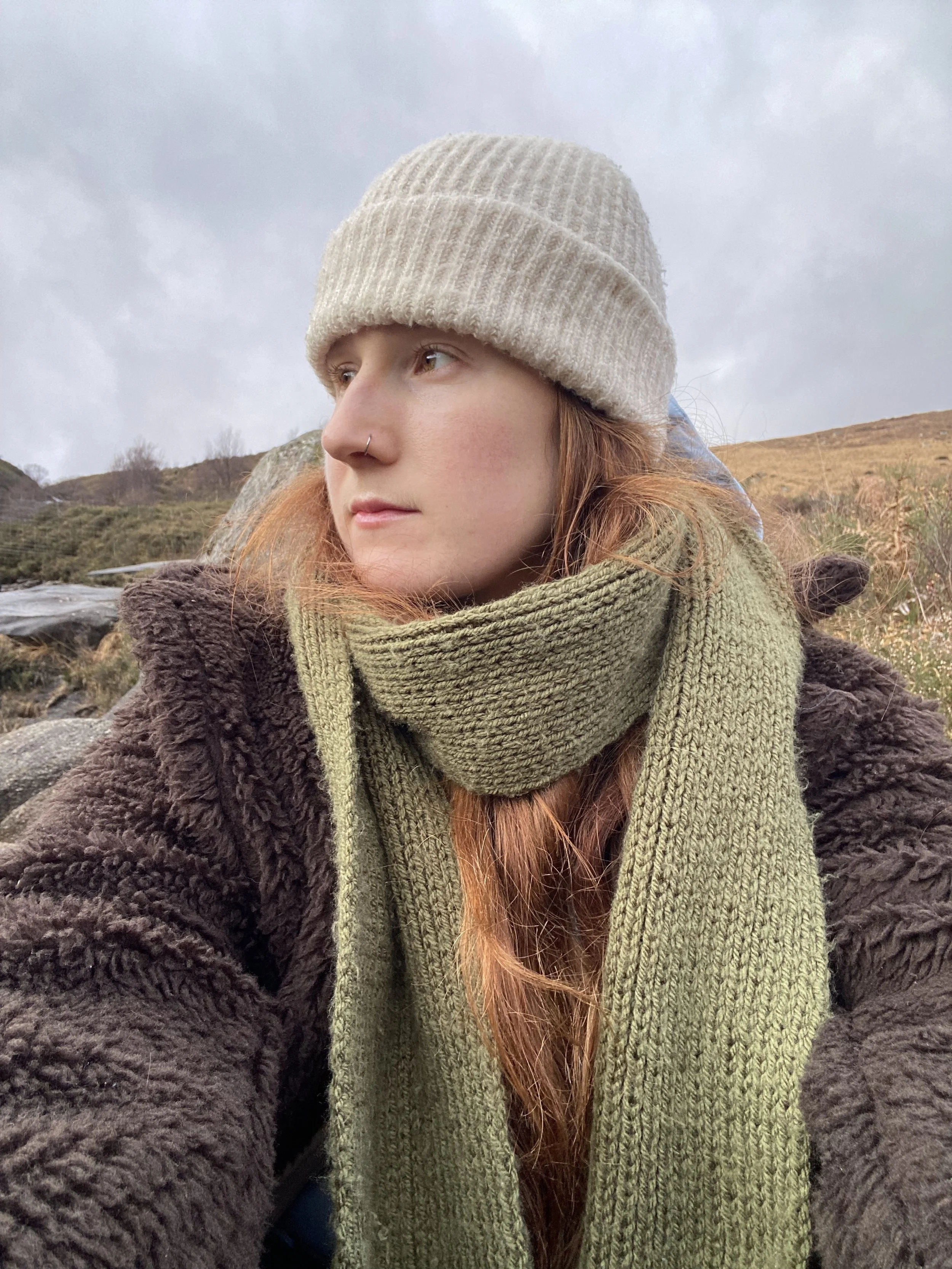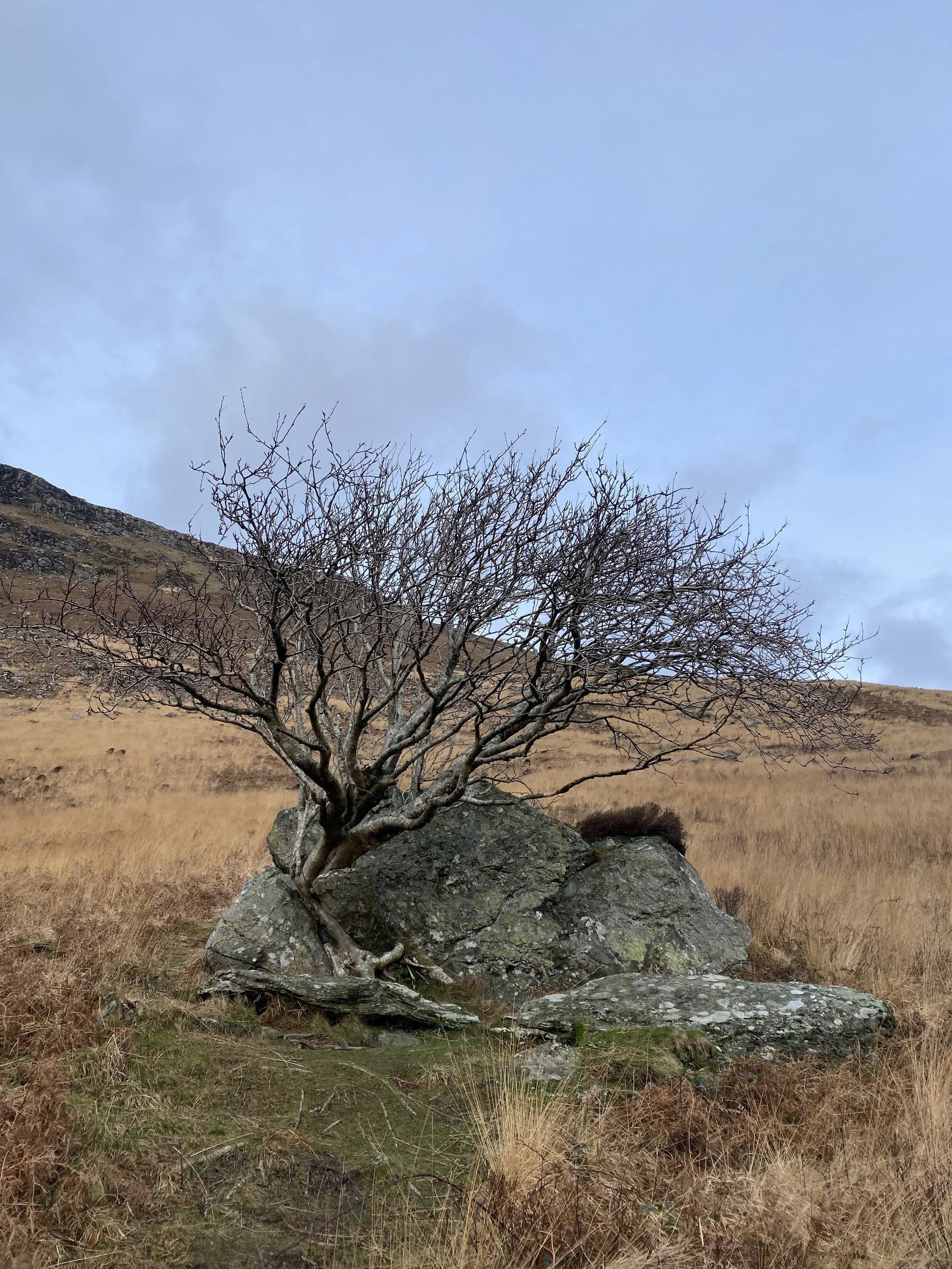 The changing of the seasons is visible here. All it takes is a moment to watch. The way the green of my scarf and the brown of my grandad’s coat are colours of the landscape. The precious island rowan tree that remembers summer fires, now locked in winter ice.